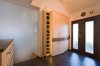 Garderoben-Einbauschränke mit Ausziehfächern für Schuhe, Kleiderstangen für Mäntel und Regalböden für Kleinigkeiten. Ein Special: Zwischen den beiden Schrankelementen befindet sich der Zugang zu einem großen Abstellraum.