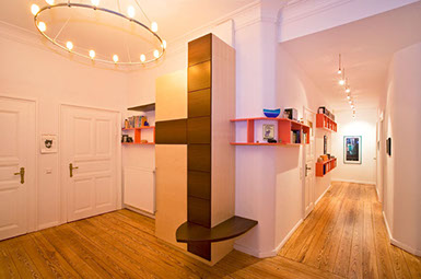 Garderobe mit Schranktüren und Sitzbank in Nussbaum und Korpusse in hellem Massivholz. Das Möbel integriert sich toll in die an der Eingangstür beginnende Linienführung mit den farbigen Regalelementen, die im Flur zu den Wohnräumen mündet.